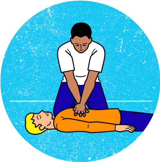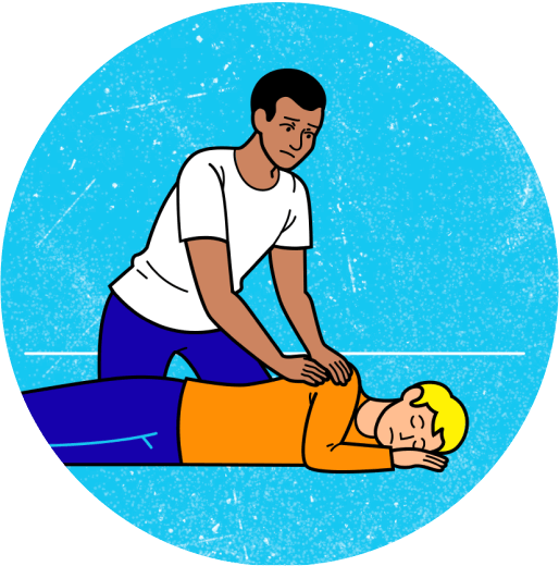 Si la persona no responde, primero levanta su cabeza y sostén su cuello. Luego sopla suavemente en la boca de la persona para darle oxígeno. Repíte dos reanimaciones repiratorias por cada 30 compresiones de pecho.